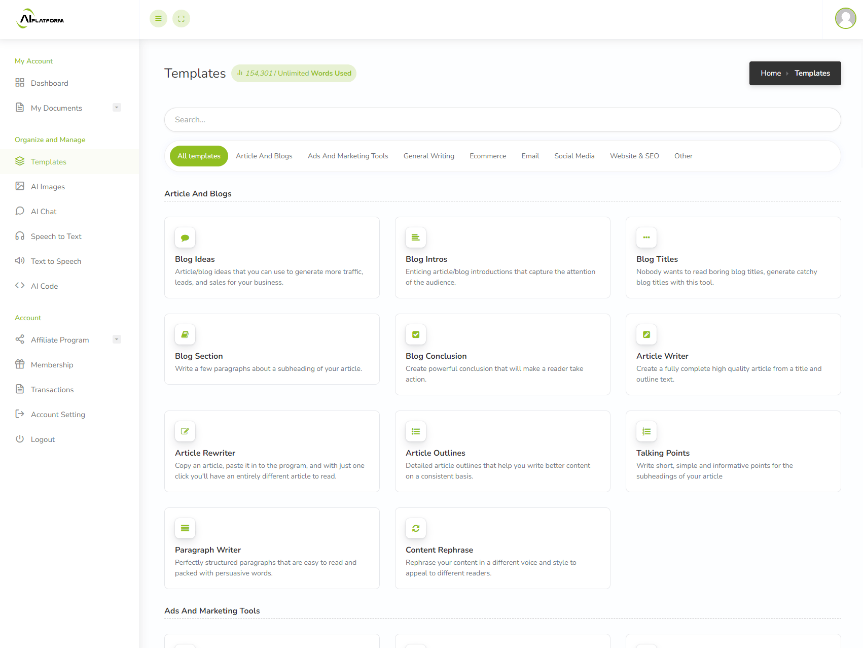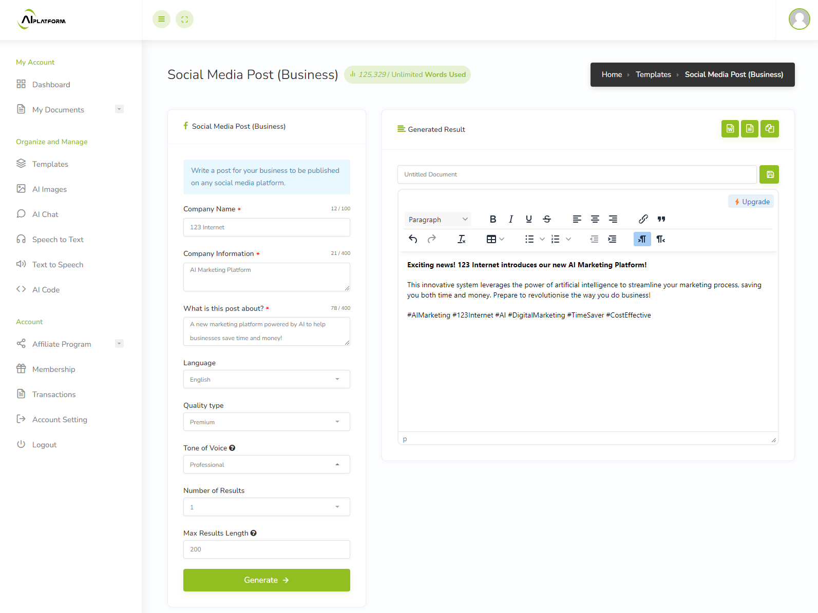 Our subscription-based AI Platform provides a means to cater to a wide range of marketing needs. It offers the ability to create written content, assist in socials, benefit SEO, and much more.