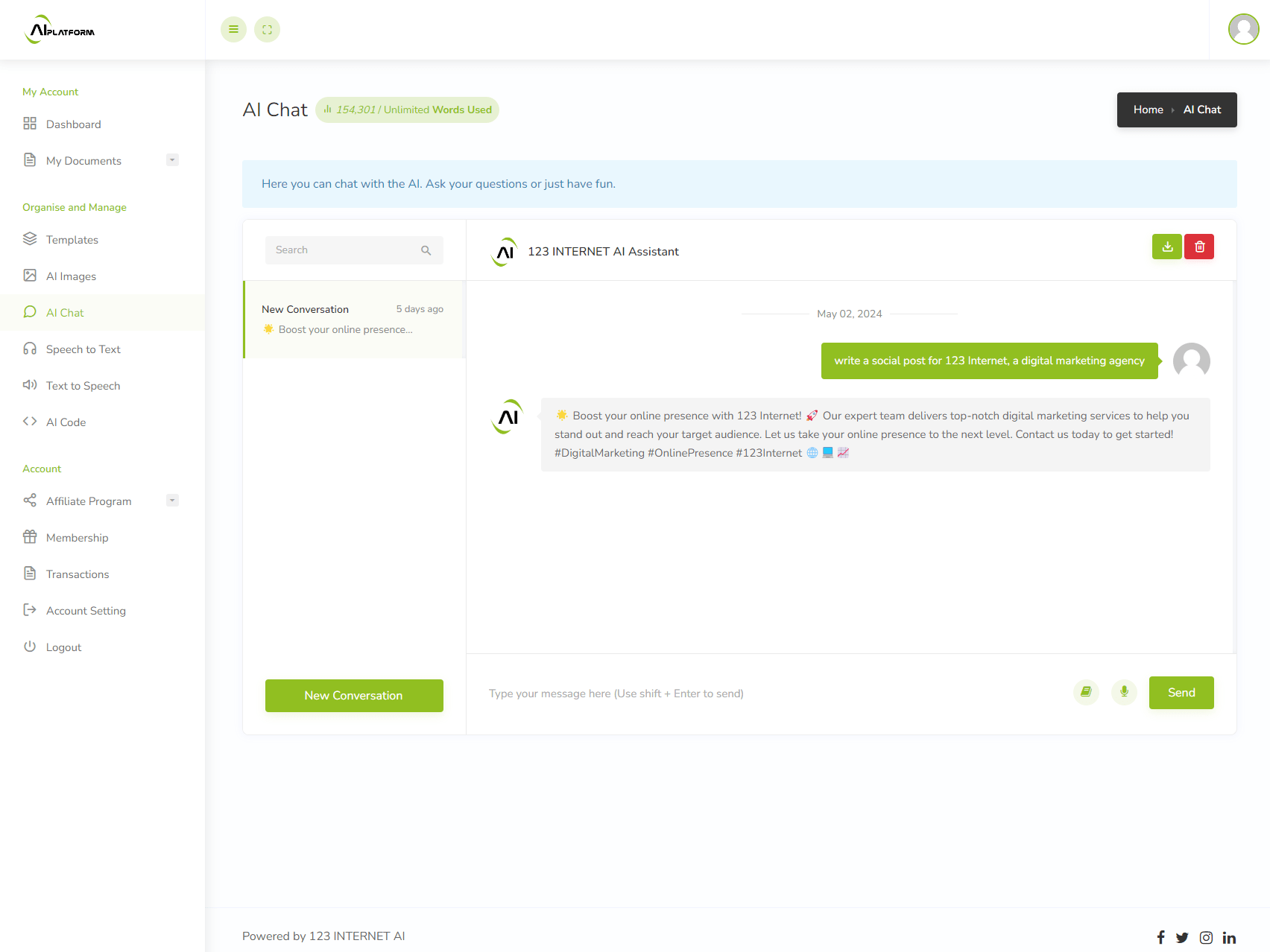 Make the most of social media and increase your social presence with the help of 123 Internet’s AI service.