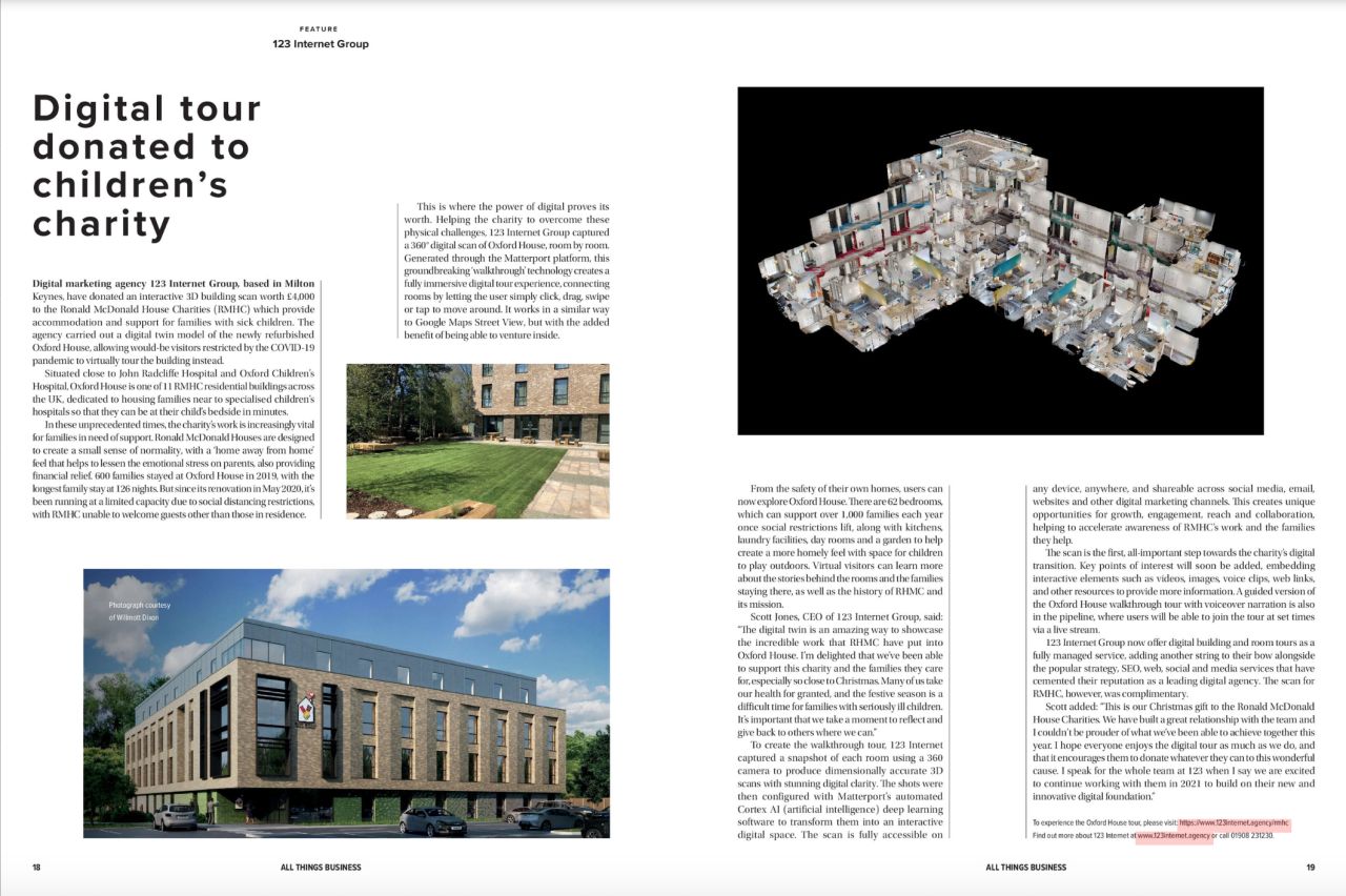 123 Internet Group, a digital marketing agency based in Milton Keynes, have donated an interactive 3D building scan worth £4,000 to the Ronald McDonald House Charities (RMHC) who provide accommodation and support for families with sick children. The local agency carried out a ‘digital twin’ model of the newly refurbished Oxford House, allowing would-be visitors restricted by the COVID-19 pandemic to virtually tour the building instead.